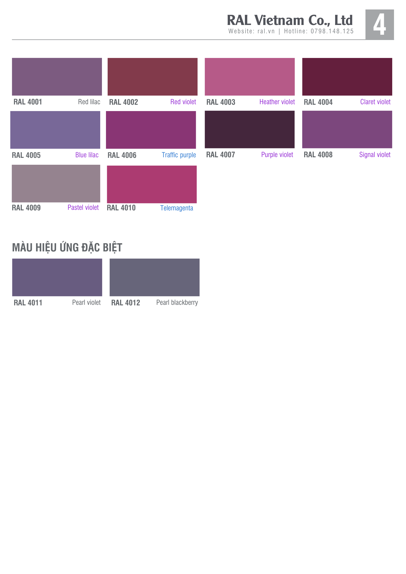Trong bảng màu RAL, các mã tím nổi bật như RAL 4008 Signal violet và RAL 4010 Telemagenta được xem là những sắc màu độc đáo, mang tính đột phá. Đây là gam màu mang lại sự tươi mới, tràn đầy năng lượng và thường được ứng dụng trong những công trình cần tạo hiệu ứng thị giác mạnh mẽ.